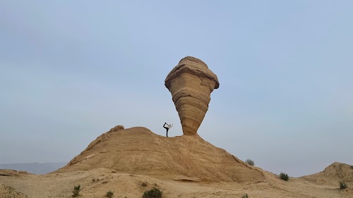 A remarkably balanced rock in the shape of an ice cream cone. It was must have been shaped by the sand erosion due to frequent sandstorms. Perhaps some geologist can tell us more about this amazing formation.