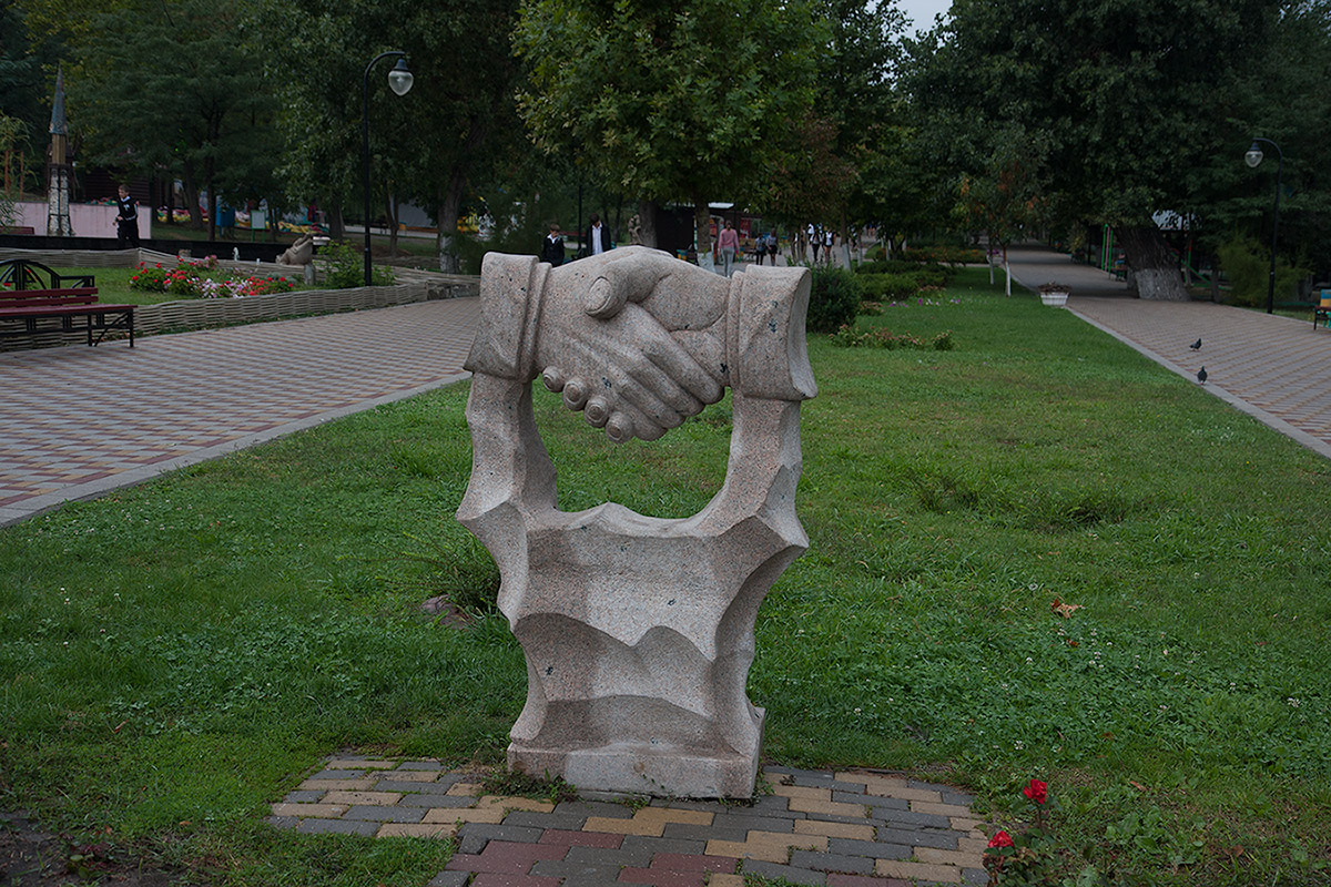 Installed in front of the Donetsk National Academic Music and Drama Theatre, the hand was a gift by oligarch Rinat Akhmetov on the the occasion of the 10th anniversary of his company System Capital Management (CJM). The artwork was commissioned in November 19, 2010 and the inscription on the pedestal read:.
